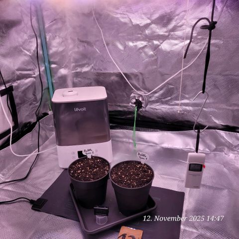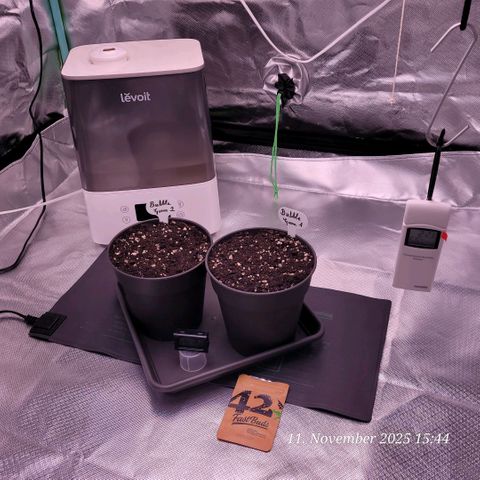 Die Samen in ihren Start Töpfen, in Erde 1,5 cm tief ein gesetzt. Wurden je Topf mit 250 ml etwas an gegossen mit Mittelchen zum besten Start aus der Bio Bizz Reihe. PH ein gestellt auf 6,3 mit Bio Bizz PH down.