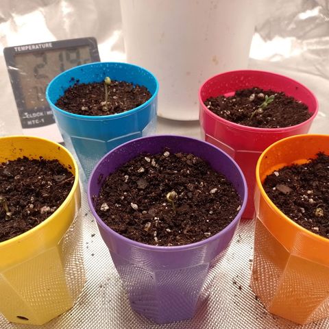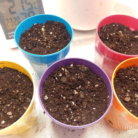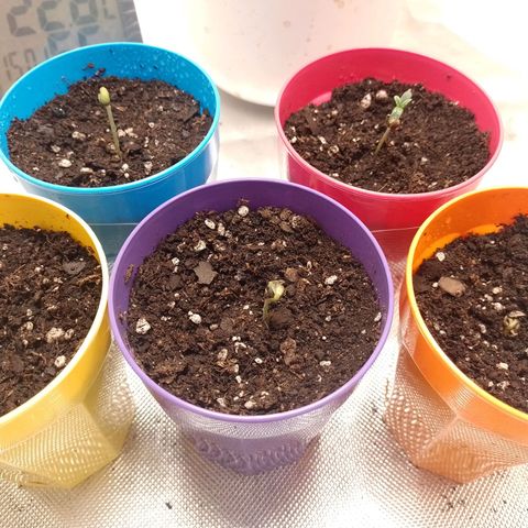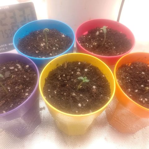 De macetin de 350cc a maceta de 5L llena hasta 3/4 aprox, regué con 500ml cada maceta, antes de que apaguen las luces